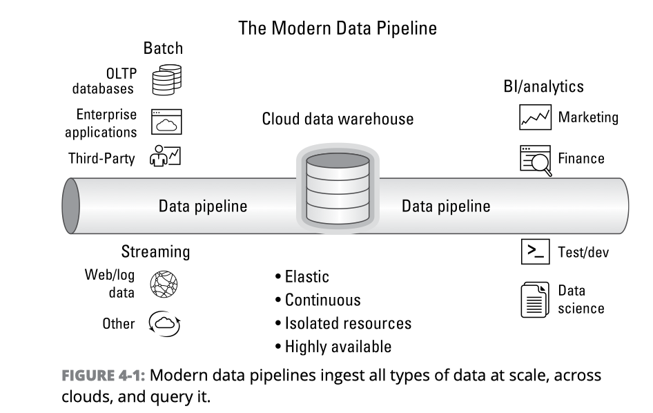 클라우드 스토리지에 지속해서 수집되는 데이터를 활용하여 실시간 분석 시스템 구축을 원할 수 있습니다. 온-프레미스 데이터를 클라우드 데이터 레이크로 마이그레이션하기 위해 데이터 파이프라인 도구를 사용합니다. 대용량 데이터 로딩 작업은 플랫폼 초기 구축 시 수행됩니다. 초기 데이터를 데이터 레이크에 적재한 뒤, 소스 시스템에 발생한 변경분을 반영하고자 할 수 있습니다. 지속적인 데이터 파이프라인(continuous data pipeline)은 새로운 데이터가 클라우드 스토리지에 저장되면, 그림 4-1과 같이 신규 데이터 파일을 자동으로 감지하여 비동기 방식으로 데이터 레이크에 지속해서 로드합니다.