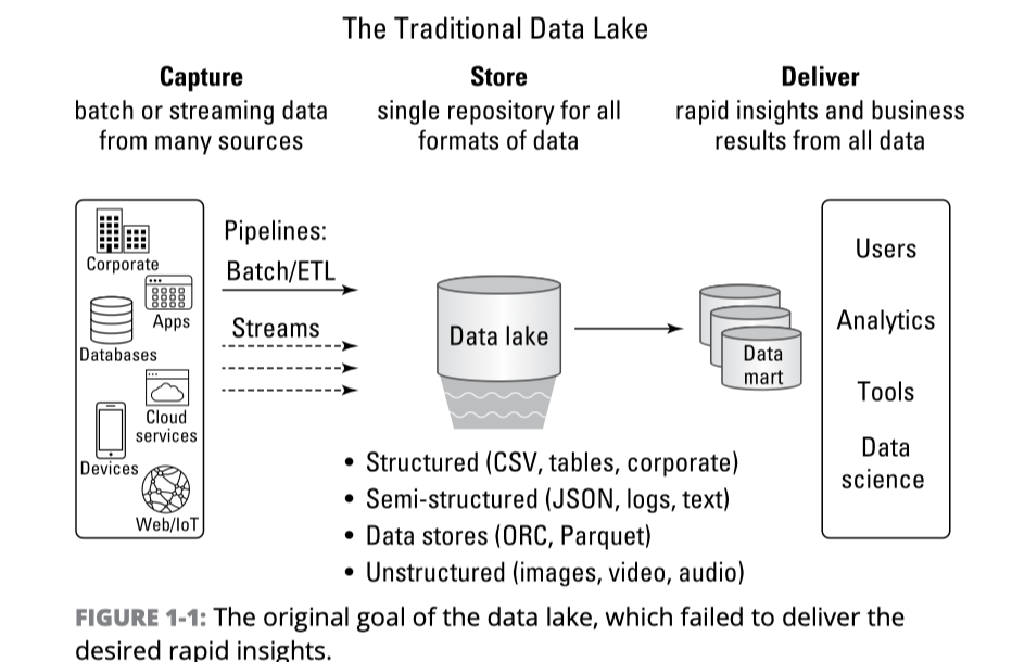 - 모든 유형의 원시 데이터를 데이터 레이크로 수집하여 저장하는 것은 가능하지만, 일부 빅데이터 전문가들만이 이 플랫폼을 통해 분석 워크로드를 수행했으며, 다른 모든 사용자들에게는 매우 어려웠습니다.