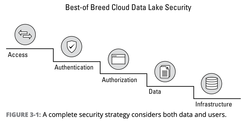 데이터 레이크의 모든 측면(아키텍처, 구현 및 운영)은 전송 및 저장되는 데이터 보호에 중점을 둬야 합니다. 이것은 현재와 새로운 보안 위협을 모두 고려한 다 계층-보안 전략의 일부여야 합니다. 보호 전략은 포괄적인 모니터링과 경고를 포함해 외부 인터페이스, 접근 통제, 데이터 스토리지 및 물리적 인프라 보안을 함께 다뤄야 합니다. 데이터 레이크 보안에 대해서 살펴보도록 하겠습니다: