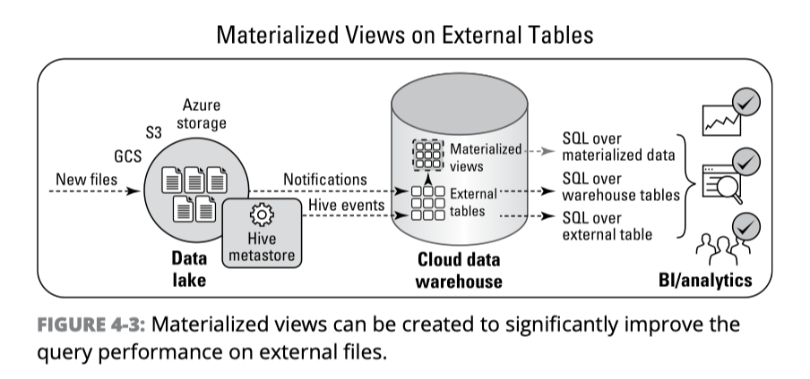 - 오브젝트 스토리지의 데이터 사용: 현대화된 데이터 레이크의 스토리지 계층은 Amazon S3, MS Azure Blob Storage 또는 Google GCS를 지원해야 합니다. 멀티-클라우드 환경에서도 데이터 레이크는 단일 데이터 소스를 유지해야 하며, 이는 멀티-클라우드의 여러 데이터 리파지토리에 데이터들이 동기화되는 작업을 제거할 수 있습니다. 이처럼 클라우드 스토리지에 저장된 원천 데이터를 SQL 엔진에서 쉽게 사용할 수 있는 기능을 제공해야 합니다. 여기에는 그림 4-3과 같이 구체화 뷰(Materialized View)도 포함됩니다. 구체화 뷰는 외부 파일의 데이터에 대한 메타데이터와 통계 정보를 미리 계산하여 쿼리 성능을 향상할 수 있습니다. 이 구체화 뷰의 장점은 데이터 갱신이 발생한 경우, 백그라운드 작업으로 데이터 변경분을 반영하기 때문에 별도의 ETL과 같은 파이프라인을 구축할 필요가 없습니다.
