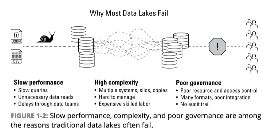 데이터 레이크가 실질적으로 유용하게 활용되기 위해서는 다양한 데이터 소스에서 생성되는 정형, 반정형, 비정형 데이터를 원천 데이터 그대로 쉽게 저장하고, 사용자는 원천 데이터를 기반으로 분석 용도로 활용할 데이터-셋을 쉽게 탐색할 수 있어야 하며, 다양한 분석 워크로드를 단일 플랫폼에서 지원해야 합니다. 그러나 오늘날 대부분의 데이터 레이크는 모든 기업에 존재하는 데이터를 효과적으로 수용할 수 없으며, 더욱이 실시간 데이터 처리를 다양한 워크로드가 실행되는 단일 플랫폼에 통합하여 적용하기가 어렵습니다. 또한, 고품질의 데이터와 거버넌스 기능을 제공하지 못한다면, 데이터 레이크 개념이 아무리 훌륭하더라도 사용자들이 데이터 레이크에 저장된 데이터를 이해하여 사용할 수 없게 되기 때문에 시스템으로써 효용 가치가 낮아질 수 밖에 없습니다. 데이터양이 많아지고 다양화될 수록 이 문제는 더 심각해 질 수 있기 때문에 데이터 레이크를 활용하여 비즈니스적으로 의미 있는 통찰력을 발굴하는 것이 점점 더 어려워집니다. 또 다른 데이터 레이크의 일반적인 문제는 그림 1-2와 같이 성능 저하, 관리 부담 증가, 하드웨어 및 소프트웨어 비용 증가 등이 있습니다.