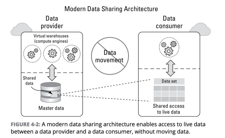 조직 내/외부에는 수많은 데이터 소스가 있으며, 많은 기업들은 외부 데이터와 내부 데이터를 함께 활용하여 분석 업무를 강화하고자 합니다. 데이터를 어떻게 공유해야 하나요? FTP, API 및 Email과 같은 기존 데이터 공유 방법을 사용하려면 데이터를 복사하여 상대방에게 전송해야 합니다. 이는, 매우 번거롭고, 고비용이며 보안 사고에 노출될 가능성이 높습니다. 특정 데이터가 공유된 경우, 변경 사항에 대한 데이터 동기화는 어떻게 해결할 예정입니까? 이는 새로운 버전의 데이터를 지속해서 이동 및 관리해야 함을 의미합니다. 앞서 살펴본 전통적인 데이터 공유 문제점을 해결하기 위해서 현대화된 데이터 공유 기술이 등장하게 되었으며, 그림 4-2와 같은 단순화된 데이터 공유를 통해 IT 운영이 간소화되고, 새로운 비즈니스 인사이트를 발굴할 수 있게 되었으며, 고객에게 더 좋은 서비스를 제공하고 나아가 데이터 수익 모델로 진화할 수 있게 되었습니다. 이 공유 방법은 데이터를 복사나 이동하지 않고 라이브 데이터를 실시간으로 공유할 수 있습니다. 이 공유 방식은 완벽한 접근 통제 및 안전한 데이터 공유 기능을 제공하기 위해서 멀티-테넌트, 메타데이터-기반 아키텍처가 필요합니다.